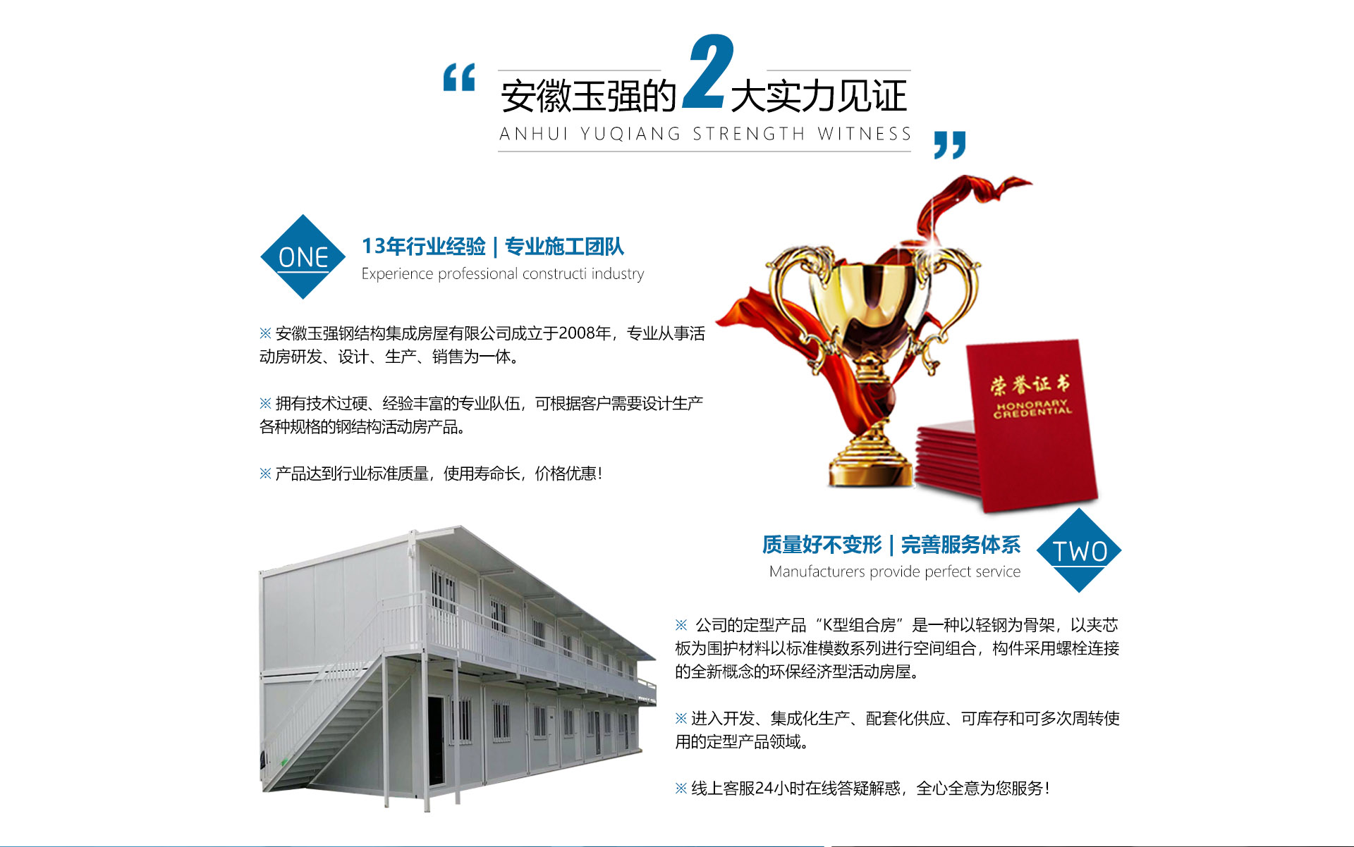 安徽玉強鋼結構集成房屋有限公司是一家集研發(fā)、設計、生產、銷售服務于一體的活動房與集裝箱制造企業(yè),公司隊伍具有多年鋼結構制作及產品檢測經驗,嚴格按照鋼結構標準要求制作、檢測。致力于提供研、產、銷、于一體,有著多年積累的先進生產技術和豐富工作經驗,采用精良的工藝技術,生產美觀大方的定型產品,長期以來,受廣大用戶的信賴和支持。歡迎您的來電咨詢。